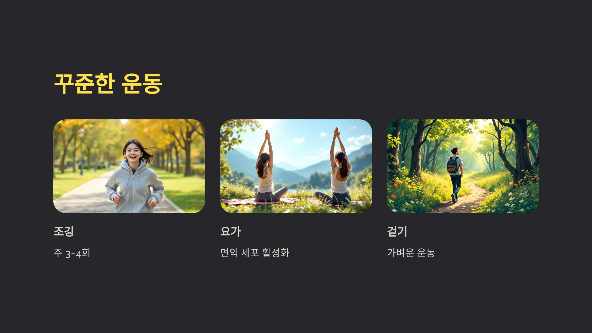 적당한 운동은 면역력을 활성화시키는 최고의 방법입니다. 걷기, 조깅, 요가 등의 가벼운 운동을 주 3~4회 정도 해보세요. 운동은 면역 세포를 활발하게 만들어 바이러스나 세균에 대한 저항력을 높여줍니다.