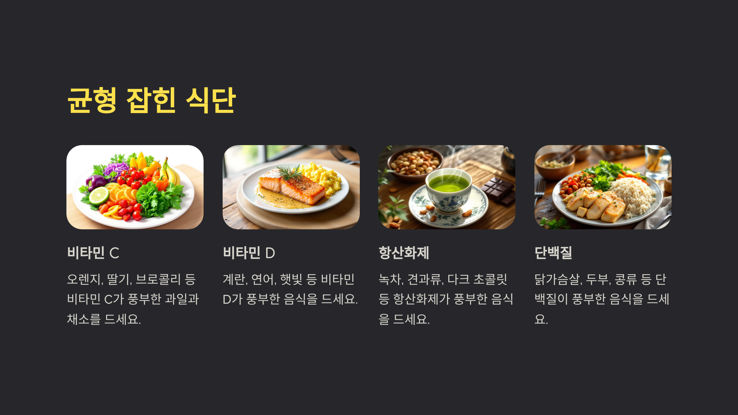 면역력을 유지하려면 영양소가 골고루 들어있는 식단이 필수적입니다. 비타민 C, 비타민 D, 항산화제, 단백질이 풍부한 음식을 매일 섭취하세요. 면역 체계는 우리가 먹는 음식으로부터 영양분을 얻어 더 강해집니다.