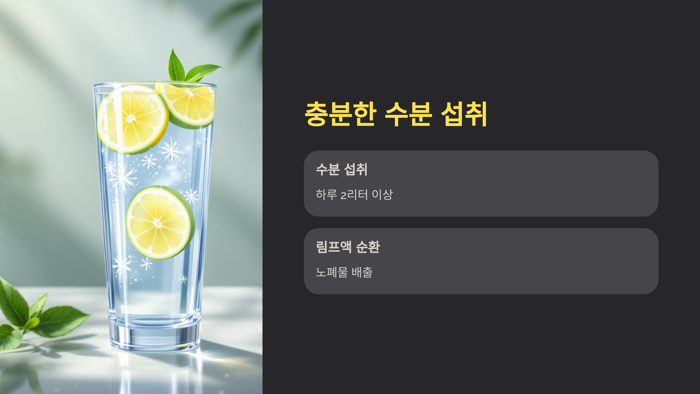 물을 충분히 마시는 것은 면역력을 강화하는 데 매우 중요한 요소입니다. 하루 2리터 이상의 물을 섭취하면 림프액 순환을 도와 몸에서 해로운 물질을 배출하는 데 도움이 됩니다.
