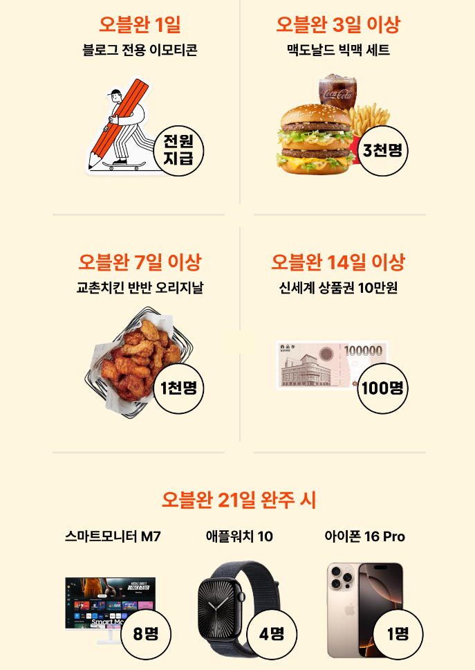 - 대상 경품: 21일 동안 매일 성실히 글쓰기를 완수한 참가자 중 추첨을 통해 스마트 모니터, 애플 워치 등 고가의 전자 기기를 선물로 받을 수 있습니다.