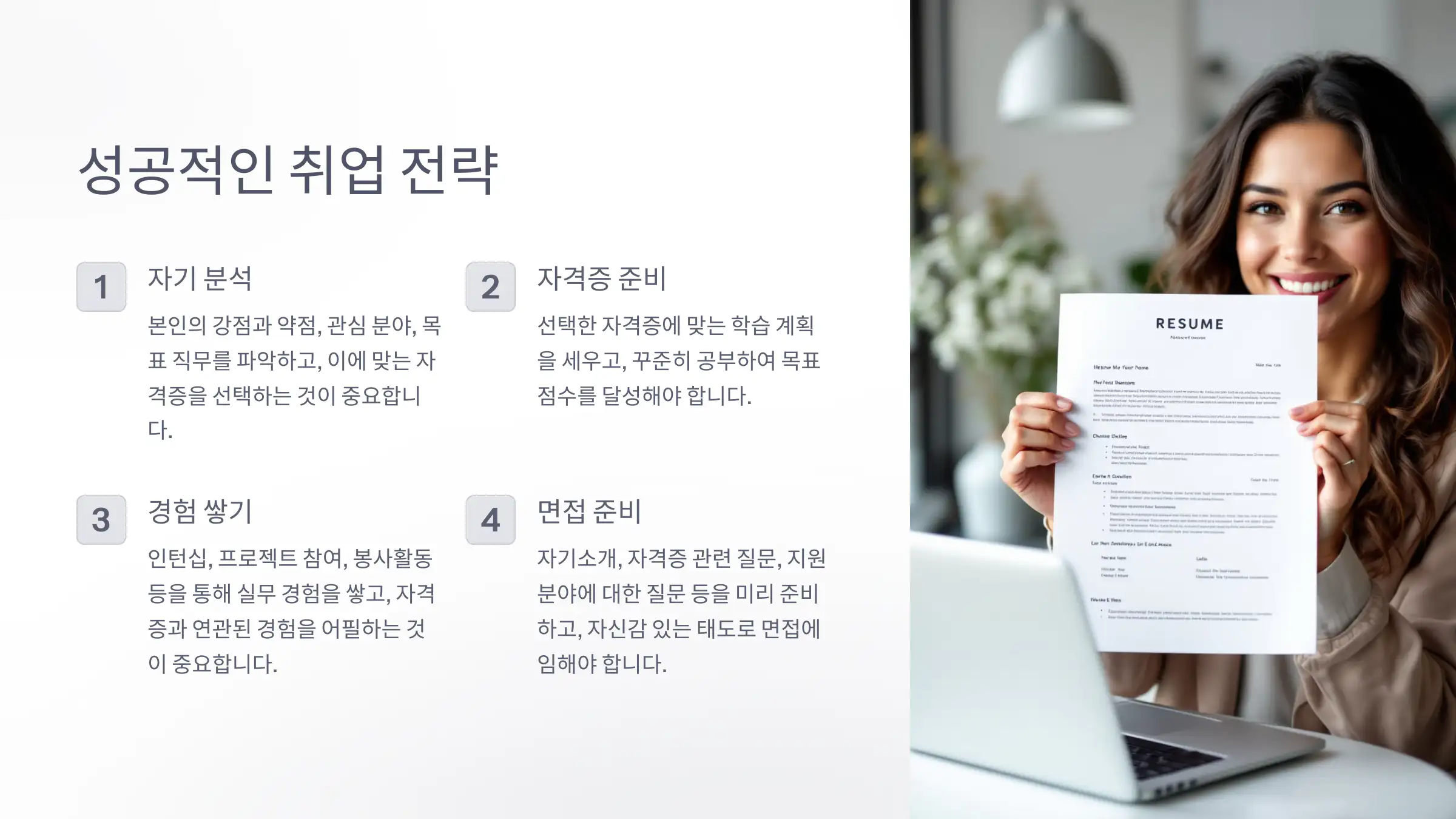 자격증은 자신감을 향상시키고, 도전 정신을 북돋아 줍니다.