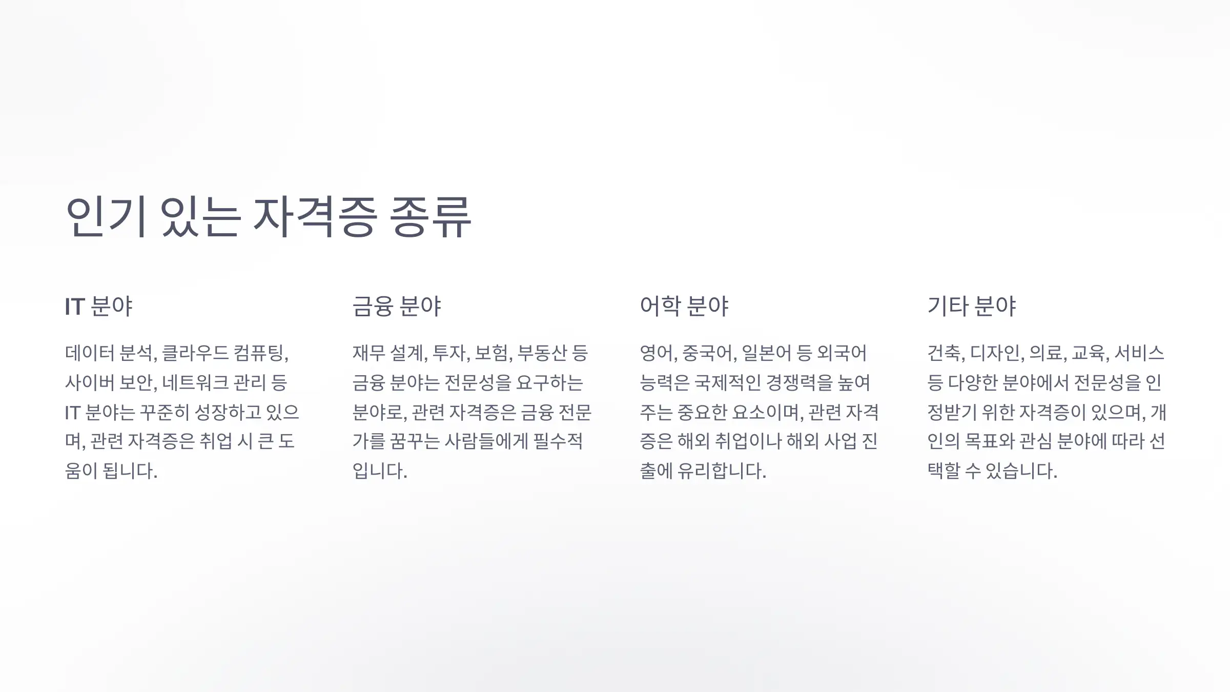 IT, 금융, 어학 분야의 자격증이 취업 시장에서 특히 유리합니다.
