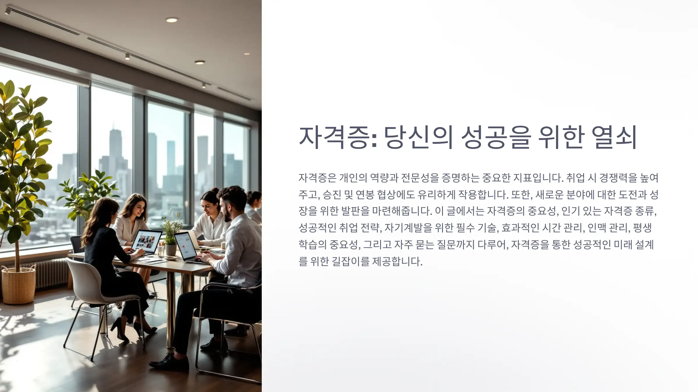 오늘날의 경쟁적인 사회에서 자격증 취득과 자기계발은 성공적인 취업과 개인적 성장의 핵심입니다. 본 가이드는 자격증 종류, 취업 전략, 자기계발 방법 등을 포괄적으로 다루어 여러분의 목표 달성에 실질적인 도움을 제공합니다.
